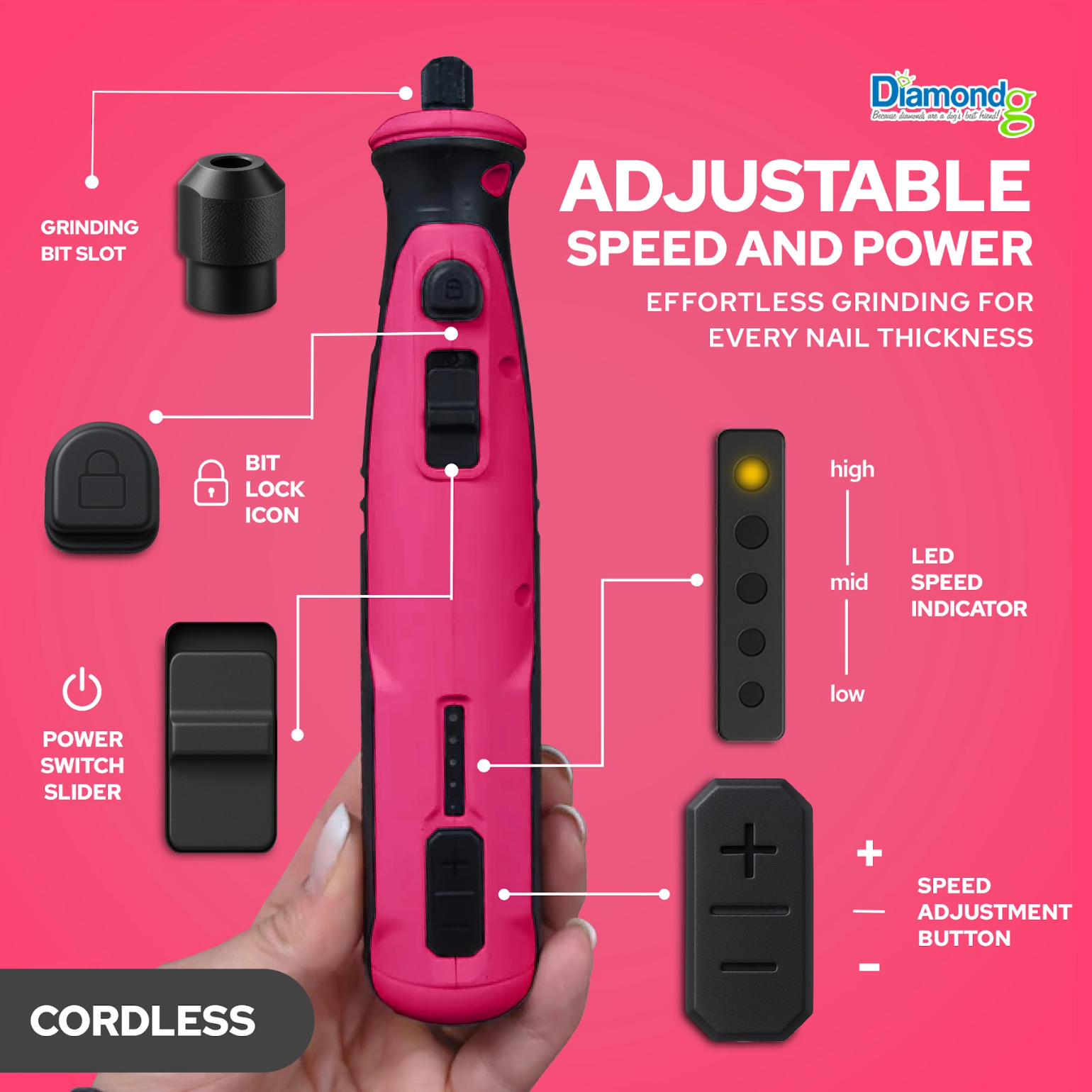 Our Diamondg rotary tool is the perfect companion for all models of our diamond bits. With lighted end for improved visibility and five speeds, this tool has the power to run all day long in any busy shop. Lighter and more ergonomic than many other rotary tools, and itβs fantastic balance, this tool will make nail grinding a breeze for the professional and home user alike! One of the best features with our new model is the bright pink or white body, making it a breeze to find in any busy shop.